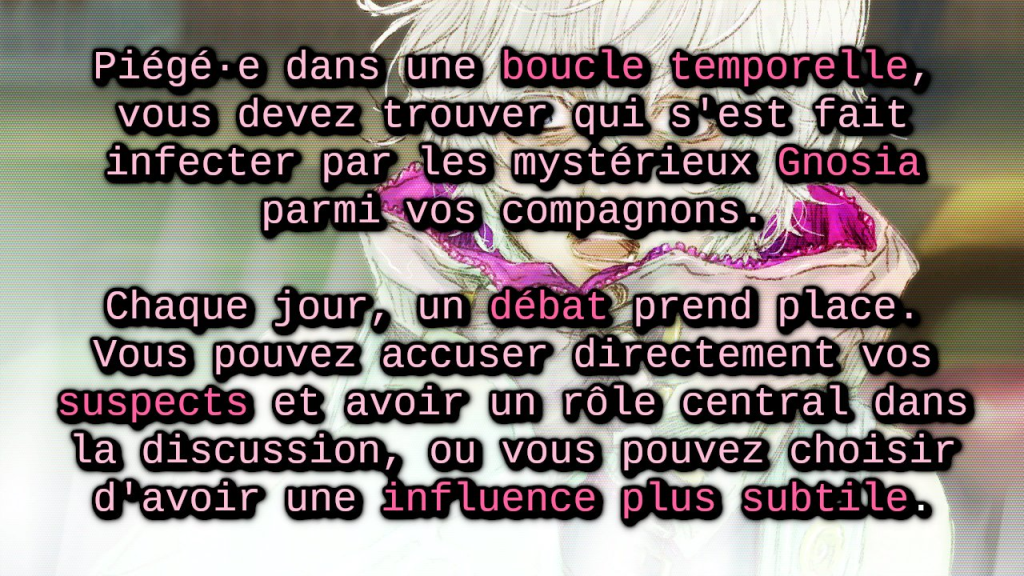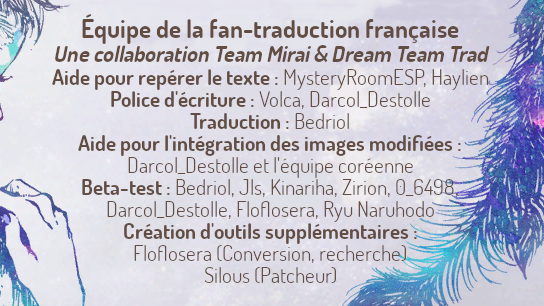 Guide : Le guide est inclus dans le patch et est disponible dans le dossier « GNOSIA ». Ne le consultez que si vous ne savez plus quoi faire pour progresser dans l’aventure. Pour voir les indices et les solutions, surlignez le texte à côté et changez sa couleur.